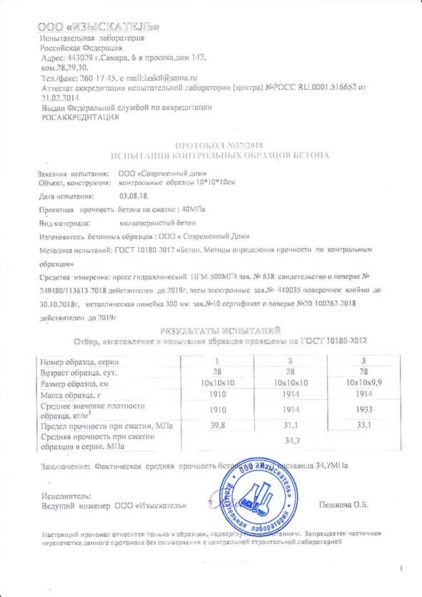 Протокол испытаний образцов бетона на сжатие компании Современный ДОМ