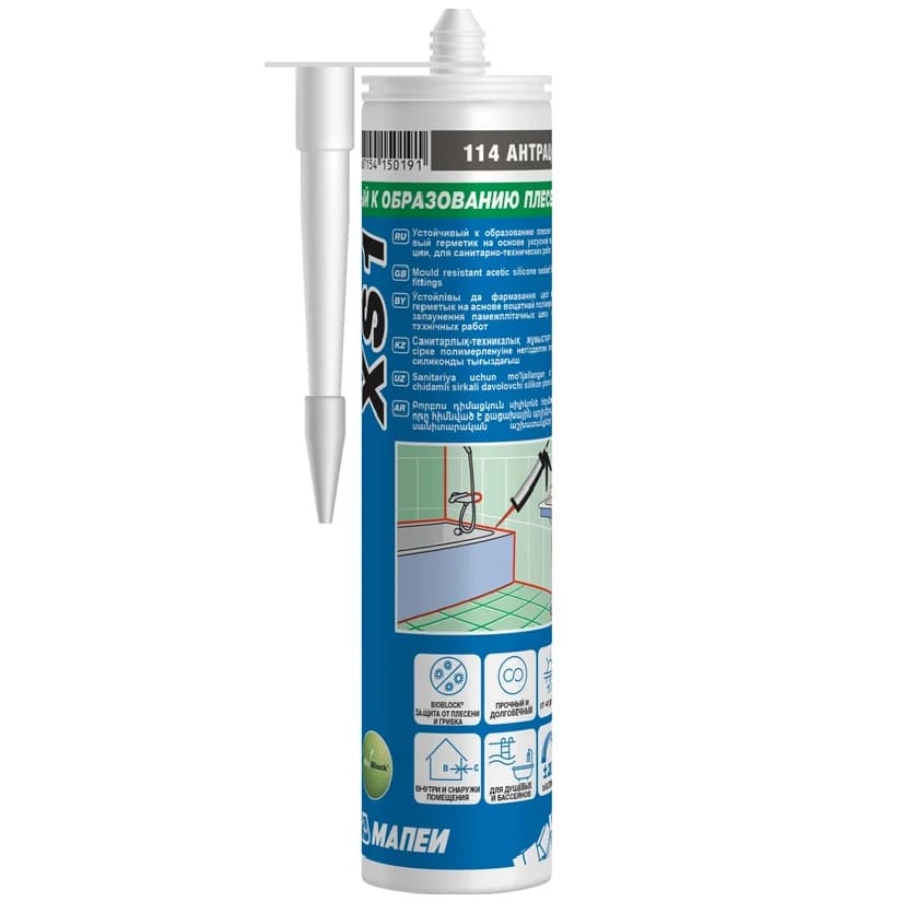 Силиконовый клей герметик Мапеи XS1 №114 — силиконовый герметик производства Mapei предназначен для заполнения деформационного шва на полах и стенах с удлинением +-25% и шва вокруг люков невидимок. Силиконовые цветные герметики не содержат растворителей и стойкие к плесени и грибку применяются во влажных условиях ванных комнат, душевых, банях, саунах и на полах и стенах помещений плавательных бассейнов, а также снаружи помещений в керамической облицовке. силиконовые цветные герметики не заменимы для герметизации неплотных примыканий в ванной комнате, например стык стены и ванны, стен и душевого поддона, а также используются для герметизации зазоров в люках невидимках под плитку. Цвет силиконового герметика подбирается в тон под затирку. В этом плане стоит обратить внимание на номер цвета.
