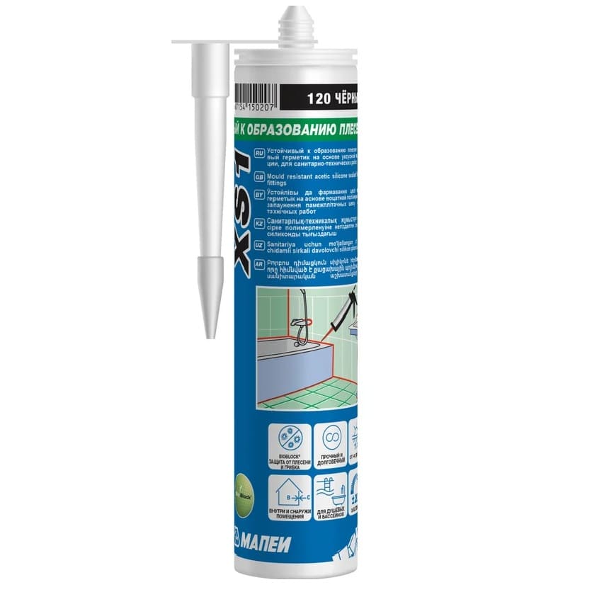 Силиконовый клей герметик Мапеи XS1 №120 — силиконовый герметик производства Mapei предназначен для заполнения деформационного шва на полах и стенах с удлинением +-25% и шва вокруг люков невидимок. Силиконовые цветные герметики не содержат растворителей и стойкие к плесени и грибку применяются во влажных условиях ванных комнат, душевых, банях, саунах и на полах и стенах помещений плавательных бассейнов, а также снаружи помещений в керамической облицовке. силиконовые цветные герметики не заменимы для герметизации неплотных примыканий в ванной комнате, например стык стены и ванны, стен и душевого поддона, а также используются для герметизации зазоров в люках невидимках под плитку. Цвет силиконового герметика подбирается в тон под затирку. В этом плане стоит обратить внимание на номер цвета.