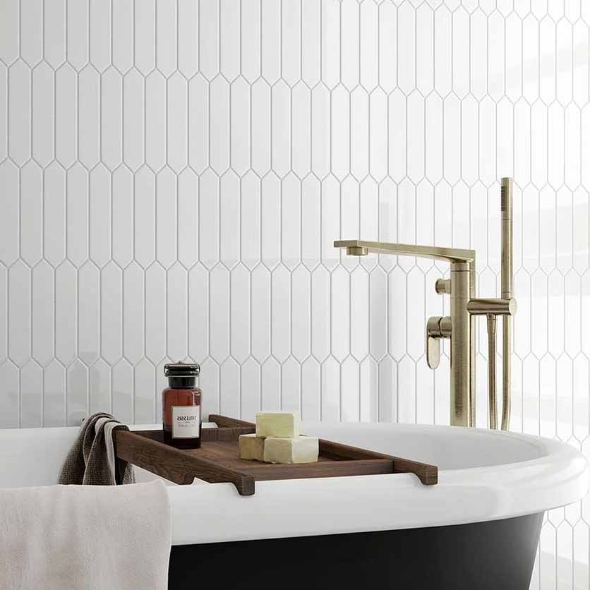 Плитка ARROW Pure White 5х25 см это настенная глянцевая керамическая плитка шестиугольной вытянутой формы. Необычный формат придает особую структуру облицовке. Применяется для отделки стен ванных комнат, санузлов, а также для фартука кухни.