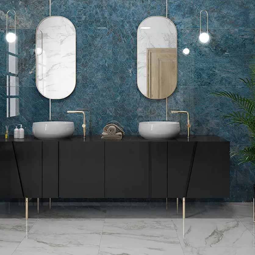 Керамогранит Cr. Lux Kionia Azzurro Pol. Rect. 60×120- керамогранит под синий мрамор с коричневыми прожилками хаотично разбивающим фактуру камня. Рисунок имитирующий многогранный синий мрамор. Он обладает ярким контрастным рисунком, в который органично вплетаются прожилки. Материал обладает супер глянцевой поверхностью и благодаря своему изысканному дизайну применяется в качестве акцентов и декора в интерьере.