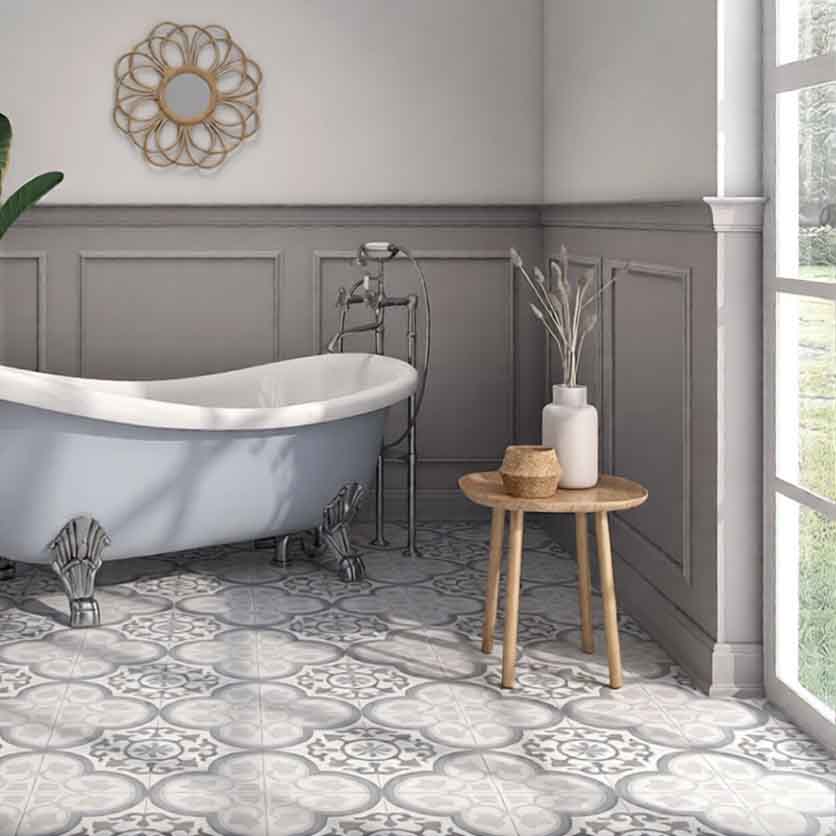 Керамогранит Vintage perla 45×45- матовый керамогранит испанского производства с рисунком. Симметричный узор в небольшом формате подходит как для небольших помещений, придавая им объем, так и для просторных, наполняя их фактурой. Отличное решение как для классических интерьеров, так и для современных смешанных стилей.