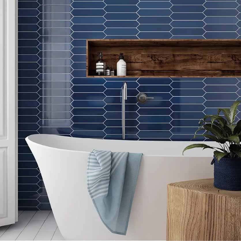Плитка ARROW Adriatic Blue Velvet 5х25 см это настенная глянцевая керамическая плитка шестиугольной вытянутой формы. Необычный формат придает особую структуру облицовке. Применяется для отделки стен ванных комнат, санузлов, а также для фартука кухни.