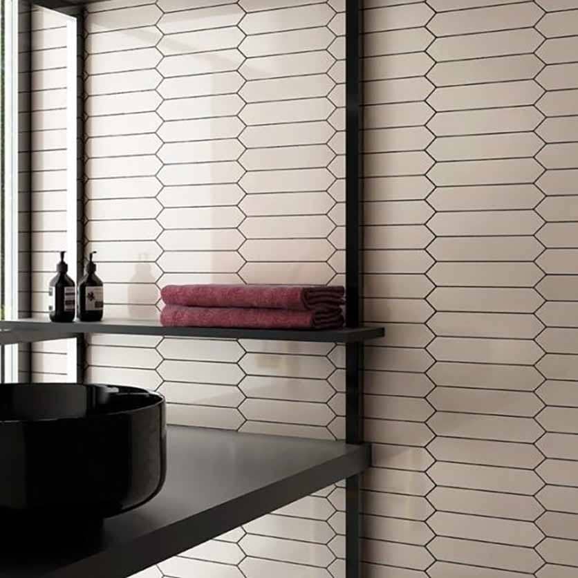 Плитка ARROW Gardenia Cream 5х25 см это настенная глянцевая керамическая плитка шестиугольной вытянутой формы. Необычный формат придает особую структуру облицовке. Применяется для отделки стен ванных комнат, санузлов, а также для фартука кухни.