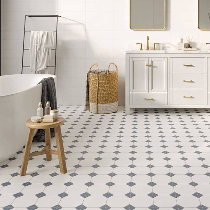 Керамогранит Canterbury Blue 33,3х33,3 см это матовый белый керамогранит в небольшом формате 33,3*33,3 см, который визуально разделен на 4 плитки. Дизайн отделочного материала разработан в стиле мелкой плитки и имитирует белые матовые восьмиугольники формата 16,5х16,5 см с синими вставками. Коллекция предполагает затирку шва как по контуру плиток, так и шов разделяющий плитку вдоль и поперек.