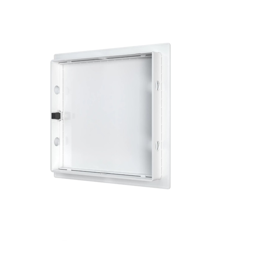 Изделие создано из прочного ABS-пластика, который отличается долговечностью и устойчивостью к ультрафиолетовому излучению. Этот материал не ржавеет и сохраняет свой внешний вид даже в условиях высокой влажности. Гладкая и глянцевая поверхность пластика не желтеет со временем. Дизайн люка универсален, что позволяет монтировать дверцу с петлями как на левую, так и на правую сторону, обеспечивая комфортное использование. Нажимной замок надежно фиксирует дверцу, предотвращая ее случайное открытие, поэтому люк можно устанавливать как на стенах, так и на потолке. Монтаж возможен с использованием клея или саморезов.