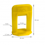 СВП- Система выравнивания плитки предназначена для укладки и выравнивания плиток и керамогранитов по плоскости во всех направлениях. Это инновационная система позволяет выложить быстро и качественно плитку или керамогранит любого формата и любой сложности как малоопытному мастеру, так и профессионалу. Для приобретения и последующей работы с СВП для плитки необходимо определиться с одним параметром- толщиной шва в укладке. Представленный СВП зажим 1мм желтого цвета предназначен для укладки плиток и керамогранита со швом 1мм. Зажим устанавливается между плиток в процессе укладки и утапливается опорной частью в клей для плитки и керамогранита. Зажим имеет отверстие шириной 9 мм для установки клина, который регулирует поворот плиты по плоскости. Система выравнивания плитки позволяет вести кладку керамической плитки и керамогранита толщиной плиток от 4 до 12 мм.