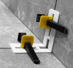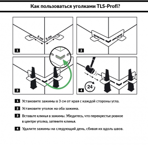 Зажим устанавливается на расстоянии 3 см от края угла керамической плиты или керамогранита. Затем на оба зажима одевается уголок (см таблицу ниже) и фиксируется клином. Клин фиксирует плитку по плоскости, прижимая ее к монтажной поверхности основания и предотвращает подъем плиты, который может произойти в процессе высыхания клея не зависимо от толщины шва в укладке. Клинья и уголки используются многократно, а зажимы- расходный материал, который после схватывания клея срезается.